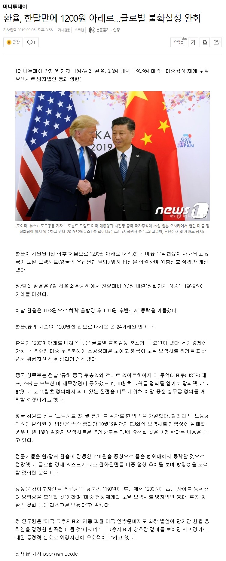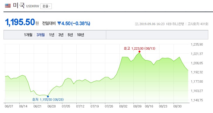 환율이 8월 1일 이후 처음으로 1200원 아래로 내려감.